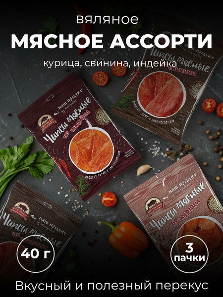 Мясные чипсы ассорти от «Костромского мясокомбината» (свинина, курица, индейка) – вкус, который вы запомните. Попробуйте мясные чипсы – уникальное сочетание натурального вкуса, изысканных специй и настоящего мясного удовольствия! Эти мясные ломтики станут вашим любимым выбором для перекуса, дополнением к активному образу жизни или изысканной питательной закуской на вечеринках. Почему наша мясная продукция – это то, что вы искали? - Натуральность и польза Только натуральный продукт – никакого фарша, сои или искусственных добавок. Снеки из мяса вяленого содержат в себе концентрированное количество белка, являясь отличным натуральным деликатесом, без химии, как здоровое питание и пп продукты. Такие снеки из вяленного сушенного мяса идеально подойдут для приверженцев ЗОЖ и тех, кто хочет оставаться в форме, наслаждаясь вкусным перекусом. - Удобно и сытно Снэки из вяленого мяса – это компактный и питательный перекус, который всегда под рукой. Будь то офис, дорога, поход или домашний уют – наша продукция подходит для любых случаев. - Качество, которому можно доверять Для изготовления испульзуется только отборное мясо, авторские рецепты маринадов и проверенные технологии сушки. Это обеспечивает нежную текстуру, аромат и насыщенный вкус каждой упаковки. - Идеальный подарок и закуска на вечеринку Яркая упаковка и необычный формат делают мясные чипсы отличным подарком на новый год и день рождения для друзей, коллег или близких. А в сочетании с любимыми напитками они создадут идеальную атмосферу для отдыха или праздника. Каждый пп перекус отвечает высоким стандартам калорийной ценности, безвредности, превосходного вкуса. Это отличный перекус для туриста и сухпаек для солдат. А также хороший набор для пива, как пивная закуска. Состав: Из индейки - грудка индейки, соль нитритная (соль, фиксатор окраски (нитрит натрия)), экстракты пряностей (перец, чеснок, чабрец). Из курицы - филе грудок куриных, соль нитритная (соль, фиксатор окраски (нитрит натрия)), экстракты пряностей (перец, чеснок, чабрец). Из свинины - свинина, соль нитритная (соль, фиксатор окраски (нитрит натрия)), экстракты пряностей (белый перец, мускатный орех, душистый перец, чеснок). Пищевая и энергетическая ценность: Из индейки - белок - 17,0 г, жир - 10,0 г; калорийность - 158 ккал/660 кДж Из курицы - белок - 23,5 г, жир - 1,7 г; калорийность - 109 ккал/460 кДж Из свинины - белок - 52,0 г, жир - 13,0г, углеводы - 1,0 г; калорийность - 330 ккал/1380 кДж Срок годности: 120 суток. Хранить при t от 0°С до +25°С и относительной влажности воздуха 75±5%. Современные технологии позволяют сохранить все богатство микроэлементов и витаминов в чипсах мясных. Благодаря легкой вакуумной упаковке снэки из вяленого мяса оптимально подходят туристам, охотникам, рыбакам и военным для перекуса в походе. Новый взгляд на привычные перекусы. Набор из 3 пачек по 40 г – это удобно, гигиенично и позволяет поделиться полезным перекусом с друзьями. Натуральность, польза и насыщенный вкус могут быть в одном наборе - в мясных чипсах из курицы, свинины и индейки!