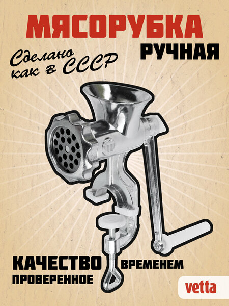 Ручная мясорубка VETTA — это надежный и простой в использовании кухонный прибор, выполненный из прочного алюминиевого сплава размером 22,5х16,5 см. Механическая мясорубка изготовлена по классической технологии, как в СССР, что гарантирует долговечность и высокое качество работы. Благодаря продуманной конструкции, мясорубка легко и надежно фиксируется на столешнице толщиной до 4 см, обеспечивая устойчивость и безопасность во время использования. Этот кухонный прибор идеально подходит для измельчения мяса дома, позволяя готовить сочные котлеты, как у бабушки, а также фарш для других блюд. Ручная мясорубка VETTA проста в эксплуатации и не требует подключения к электричеству, что делает её удобной для использования в любых условиях — дома, на даче или в походе. Компактные размеры и легкий вес обеспечивают удобство хранения и транспортировки. Классическая мясорубка VETTA станет незаменимым помощником на вашей кухне, позволяя быстро и эффективно перерабатывать мясо, сохраняя его свежесть и натуральный вкус. Прочный алюминиевый сплав обеспечивает долговечность и устойчивость к коррозии, а простота конструкции облегчает уход и чистку прибора. Этот кухонный прибор сочетает в себе традиции и надежность, подходя как для повседневного использования, так и для любителей домашних блюд.