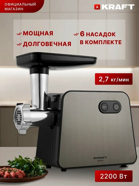 Погрузитесь в мир мощи и производительности на вашей кухне с мясорубкой Kraft мощностью 2200 Вт. Она легко перерабатывает до 2,7 кг мяса в минуту, что значительно ускоряет подготовку фарша для всей семьи. Разнообразный комплект насадок расширяет функциональность устройства, делая его незаменимым помощником. Корпус и лоток из качественного пластика обеспечивают долговечность и легкость. Функция реверса позволяет легко освобождать шнек от намотавшихся жил, а прорезиненные ножки надежно фиксируют прибор на поверхности даже при максимальных нагрузках. С помощью различных насадок вы сможете не только готовить фарш, но и делать домашние колбасы, сосиски или кеббе, что делает мясорубку универсальным инструментом для воплощения кулинарных идей. Высокопрочный нож с уникальной "сабельной" заточкой эффективно справляется с любым видом мяса, обеспечивая легкость и скорость нарезки без лишних усилий.