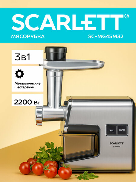 Мясорубка с функцией реверс, насадки для кеббе, сосисок SCARLETT SC-MG45M32