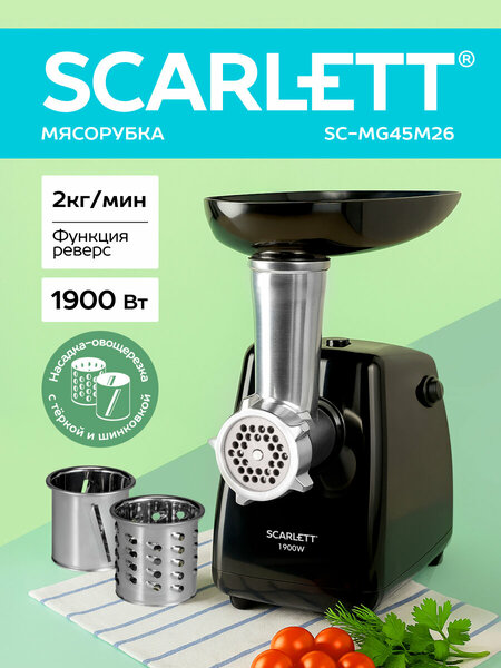 Многофункциональная мясорубка SC-MG45M26 – надежный помощник, который облегчит приготовление многих блюд! Прибор оснащен металлическим диском для фарша с отверстиями 5 мм, дополнительной насадкой с барабанами для тёрки и шинковки овощей, а также специальными насадками для приготовления домашних колбас и кеббе. Механический фиксатор надёжно закрепляет металлический блок. Функция реверса помогает быстро очистить шнек от намотавшихся жил. Насадки легко отмываются от жира и грязи. Прорезиненные ножки помогают мясорубке оставаться устойчивой на столешнице.