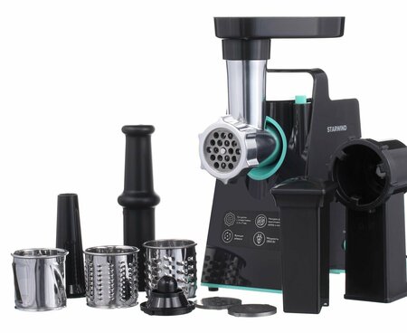 Мясорубка STARWIND SMG5480 выполнена в стильном и эффектном дизайне, который гармонично впишется в интерьер любой кухни. Технику можно установить на отдельной полке или найти место на рабочей поверхности. Комплектация Модель по праву заслуживает звание универсального комбайна. Помимо выполнения своих основных функций, заключающихся в измельчении мясных продуктов, технику можно применять в качестве шинковки или терки для измельчения овощей, фруктов. Набор включает в себя специальные насадки, необходимые для приготовления домашних колбасок и кеббе, терку, шинковку, а также три диска с перфорацией, отверстия которых в диаметре 3, 5 и 7 миллиметров. Незаменимый помощник За счет мощного двигателя изделие может за минуту измельчить до двух килограммов мяса птицы, рыбы, телятину, свинину или говядину. Высококачественные ножи, изготовленные из нержавеющей стали, с функцией самозатачивания отличаются длительным сроком службы. В модели предусмотрена функция реверса, что позволяет без посторонней помощи изъять застрявшие кусочки продуктов, при этом мясорубку разбирать нет никакой необходимости. Все элементы съемные, их можно мыть в посудомоечной машинке.