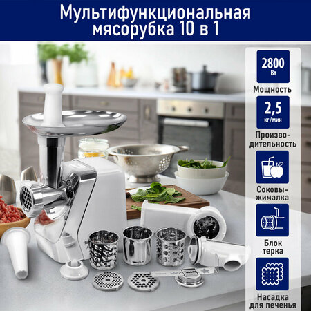 Мясорубка STINGRAY ST-MG2502C белый жемчуг - мощный и функциональный помощник на вашей кухне. Мощность и производительность: мясорубка оснащена мощным двигателем на 2800W, что обеспечивает быстрое и качественное измельчение мяса. Прочный материал: нож и шнек изготовлены из нержавеющей стали, что гарантирует долгий срок службы и устойчивость к коррозии. Корпус мясорубки выполнен из пластика, а лоток - из алюминия, что делает ее легкой и прочной. Функция реверс: в случае застревания мяса в шнеке, вы можете воспользоваться функцией реверс, которая позволит легко и быстро устранить проблему. Защита двигателя от перегрузки: мясорубка оснащена системой защиты двигателя от перегрузки, что предотвращает его износ и продлевает срок службы. В комплекте с мясорубкой идут решетки для приготовления фарша с перфорацией 3.0/5.0/7.0, блок-терка (мелкая, крупная, шинковка), насадка-соковыжималка, насадки для колбас и кеббе, насадка для печенья и толкатель. Выбирая мясорубку STINGRAY ST-MG2502C белый жемчуг, вы получаете мощный, надежный и функциональный инструмент для приготовления разнообразных мясных блюд и заготовок.