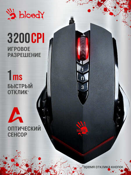 Мышь A4Tech Bloody V8 – оптическое устройство с большим набором возможностей Мышь является обязательным аксессуаром для каждого геймера. От такого устройства зависит очень многое, поэтому к выбору следует подходить с особой тщательностью. Рассматривать необходимо не только дизайн, функционал является первоочередным фактором, позволяющим стать первым в любой игре, без труда пройти все испытания. Мышь A4Tech Bloody V8 - это воплощение инновационных возможностей и последних технологических разработок. Она является проводной и оснащена большим количеством возможностей. Симметричный дизайн относится к неоспоримым преимуществам. Геймер в любой ситуации успеет предпринять необходимые действия, т. к. время отклика составляет 1 мс. Корпус характеризуется эргономичным дизайном. Его удобно держать в руке, управлять всеми переключателями и скроллом. Минимальное трение обеспечивают металлические износоустойчивые ножки. Кабель имеет длину 1,8 м и облачен в тканевую плотную оплетку. Такое решение обеспечивает не только внешнюю эстетику, но и безопасность, длительный срок использования. Устройство имеет 8 кнопок и внутреннюю память 160 КБ. Яркая подсветка создает особую игровую атмосферу и настраивает геймера на победу. Особенности Благодаря системе ММО (Ultra Core 4 & Macros) пользователь имеет возможность настроить последовательность сложных команд, которая будет выполняться при помощи одного клика. Ножки на корпусе помогают работать на поверхностях разного качества с высокой точностью, а также минимизируют трение. Технология калибровки 16-Grade гарантирует высокую точность отслеживания. Геймеру предлагаются шесть режимов снайперской стрельбы, выбор оружия и способа его использования. Оптический сенсор и регулируемое игровое разрешение гарантируют точность, мощность и скорость на пути к победе. 2 боковые кнопки В игровой оболочке назначение боковых клавиш может меняться при помощи специальных настроек. В обычном режиме они выполняют функции «вперед/назад». Преимущества мыши A4Tech Bloody V8 · Тематический стильный симметричный дизайн. · Мерцающая красная подсветка · Износоустойчивость металлических ножек. · Высокоточная технология калибровки. · Возможность быстро выбрать тип оружия и способ стрельбы. · Наличие шести снайперских режимов. · Частота опроса 125~1000 Гц. · Регулируемое максимальное разрешение 3200 CPI. · Скорость отслеживания 75 дюймов/сек. · Гибкий кабель длиной 1.8 м в тканевой оплетке. Описание функциональной игровой мыши Оборудование является точным, быстрым и мощным. Мышь придет на помощь каждому геймеру независимо от его опыта: даже новичок сможет существенно продвинуться в игре и покорить ранее недоступные вершины. Быстрое время отклика, высокая скорость обработки и другие характеристики гарантируют возможность не просто все успеть, но и на шаг опередить соперников. Мышь A4Tech Bloody V8 создана для ярких и незабываемых побед.