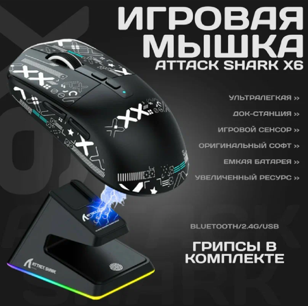 Мышка беспроводная для компьютера Attack Shark X6 - это высококачественный продукт, который зарекомендовал себя как надежный и удобный инструмент для работы и игр. Мышь имеет эргономичный дизайн, который обеспечивает комфортное положение руки и минимизирует усталость при длительном использовании. Это особенно важно для геймеров, которые проводят много времени за компьютером. Мышка беспроводная для ноутбука оснащена оптическим светодиодным сенсором с разрешением 26000 dpi, что обеспечивает высокую точность перемещения курсора и работу с мелкими деталями. Скорость движения составляет 650IPS, а кратность ускорения свободного падения - 50G. Мышь компьютерная игровая подключается к устройству через Bluetooth, с помощью радиоканала 2.4G или по USB-кабелю (идет в комплекте). Игровая мышь проводная оснащена семью клавишами, включая колесо прокрутки, что делает ее удобной для использования в различных приложениях. Игровая мышь с боковыми кнопками выполнена в стильном черном цвете и имеет размеры 118.3х62.2х37.3 мм и вес 49 грамм, что делает ее компактной и легкой для переноски. В комплект поставки входит: мышка игровая Attack Shark X6, док-станция с подсветкой, USB-ресивер, USB-кабель с тканевой оплеткой, грипсы и руководство пользователя. Игровая мышка поставляется в оригинальной упаковке, подойдет в качестве подарка.