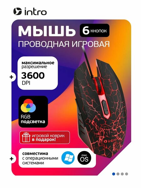 Мышь компьютерная игровая проводная Intro MG610 и коврик с RGB подсветкой Полноразмерная игровая мышь Intro MG610 с многоцветной переливающейся подсветкой станет отличным выбором для любителей компьютерных игр. Благодаря 6 программируемым кнопкам и эргономичной форме, мышь обеспечивает комфортное и точное управление в играх. Оптический сенсор с максимальным разрешением 3600 dpi позволяет точно отслеживать движения мыши, что особенно важно для динамичных игр. Мышь подключается к компьютеру через провод USB длиной 1,5 метра, что обеспечивает свободу движений и избавляет от необходимости постоянной зарядки. Коврик с RGB подсветкой и размерами 130x68x35 мм обеспечивает гладкую и точную работу мыши на любой поверхности. В комплекте с мышью Intro MG610 идет программное обеспечение Intro Gaming, которое включает редактор макросов и функцию настройки мыши. Это позволяет настроить мышь под индивидуальные предпочтения и улучшить игровой процесс. Мышь Intro MG610 выполнена в классическом черном цвете и имеет вес 140 г, что делает ее удобной для длительного использования. В подарок к мыши Intro MG610 идет коврик с RGB подсветкой, который добавит атмосферности и удобства в вашу игровую сессию.