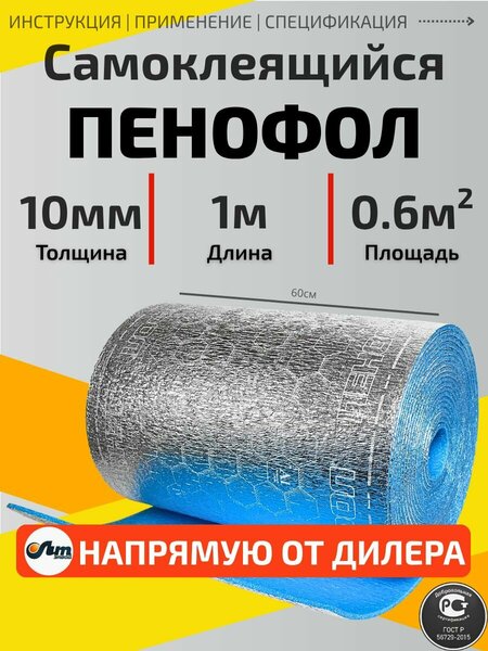 1м пенофол С 10мм Самоклеящийся фольгированный утеплитель для стен (0.6м2)