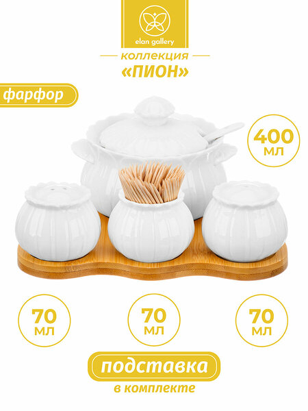 Набор "Цветок" на бамбуковой подставке состоит из сахарницы с фарфоровой ложкой, вазочки под зубочистки, солонки и перечницы. Размер комплекта 19,5х17х10 см. Зубочистки входят в комплект. Баночки выполнены из белого фарфора. Размеры ёмкостей: сахарница на 400 мл 13х11х9 см, вазочка под зубочистки и баночки для специй – по 70 мл 6х6х5 см каждая, подставка из бамбука – 19,5х17х1 см. Ёмкости для специй снизу имеют отверстия для наполнения, которые закрываются пластиковыми пробками. Фарфоровый набор посуды станет прекрасным дополнением к вашему столу и подойдет к любому интерьеру кухни, столовой или гостиной. Используйте набор для хранения сахара, соли, перца, любых специй и приправ. Каждая баночка будет выполнять свою функцию и сделает прием пищи удобным. Сахарница подойдет не только для хранения сахара, вы можете использовать ее для меда, варенья, орешков или любых сыпучих продуктов. Фарфоровые детали набора можно мыть в посудомоечной машине. Бамбуковые детали нельзя замачивать и использовать в посудомоечной машине! Поставляется в картонной упаковке. Баночки станут чудесным подарком для близких и друзей. Подарите посуду маме, бабушке, подруге, сестре, или украсьте свою кухню стильным и функциональным аксессуаром. Набор посуды "Цветок" станет украшением вашей кухни и поможет создать на ней уют.