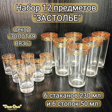 Оригинальный набор из 12-ти предметов "застолье" с декором "золотая вязь", сочетают в себе яркий дизайн и функциональность. Набор состоит из шести высоких стаканов объёмом 230 мл, диаметром пойла 60 мм, диаметром дна 50 мм, высотой 123 мм, и шести стопок объёмом 50 мл, диаметром пойла 45 мм, диаметром дна 40 мм, высотой 68 мм. Ручная работа! Набор можно использовать сразу весь, а также и по отдельности. Стопки для употребления спиртных напитков, таких как виски, ром, коньяк, бурбон, водка. А стаканы для сока, коктейлей, лимонада, компота и воды. Набор "застолье" станет отличным подарком на любой праздник: День рождения, Новоселье, Новый Год, Рождество, Юбилей, 23 февраля… А также будет оригинально смотреться на фуршете или торжественном обеде, и точно не останется незамеченным! Мама, подруга, родители и друзья наверняка оценят такой стильный и нужный презент! Стаканы и стопки станут отличным сувениром и коллеге, тренеру, врачу. Да и себя порадовать в скучной повседневности- отличное решение! Для закрепления декоров, вся наша продукция проходит дополнительный обжиг, тем самым придавая изделиям прочность, блеск и насыщенные цвета. Декорированную посуду не рекомендуется мыть в посудомоечной машине, а также с использованием абразивных чистящих средств. Чтобы максимально снизить риск повреждения товара во время доставки, каждые стакан и стопка упаковываются в воздушно-пузырчатую плёнку, изолон и картон, что и сохранит товарный вид продукции. Дополнительно рекомендуем обратить внимание на наши коллекции других красивых изделий с интересными, оригинальными декорами! Будем рады хорошим отзывам! С уважением и заботой, "Dим-Dом" Посуда для ВАС!