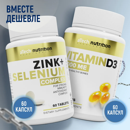 Комплект Цинк-селен + витамин Д3 Комплекс цинк селен (ZINC SELENIUM VITAMIN C). Цинк селен с витаминами А, Е, С - это сбалансированный комплекс с антиоксидантной активностью, витамины для поддержки иммунитета, красоты волос и ногтей. В комплексе селен и цинк способствует повышению активности иммунных клеток, что помогает не только ускорить выздоровление от вирусных заболеваний, но и избежать рисков развития осложнений. Цинк оказывает значительное участие в синтезе разных анаболических гормонов влияя на репродуктивную функцию у мужчин. Selenium тормозит процессы старения, улучшает состояние кожи, волос и ногтей. Витамины усиливаю действие добавки. Дефицит витамина Д3 2000 МЕ (vitamin D3, он же холекальциферол) приводит к нарушению обмена кальция и фосфора. Недостаток витамина Д3 отрицательно воздействует на костную систему и увеличивает риск развития остеопороза. Низкий уровень витамина Д в организме может быть связан с рядом заболеваний: онкологическими процессами, артериальной гипертензией, возрастным снижением когнитивных функций, нарушениями со стороны иммунной и репродуктивной систем. Также vitamin D3 улучшает настроение, повышая в организме уровень серотонина.