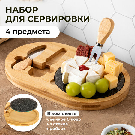 Набор для сервировки сыра от Elan Gallery 28х18х2 см состоит из 4 предметов: доска для подачи из натурального бамбука, съёмное круглое сервировочное блюдо из стекла, нож и вилочка для сыра. Диаметр круглого блюда для сервировки 14,5 см, размер вилки 13х3х1,6 см, размер листовидного ножа для твёрдых сыров 12х3х1,6 см. Круглая стеклянная тарелочка для сервировки вставляется в бамбуковую подставку и имеет расцветку, имитирующую мрамор. Столовые приборы выполнены из нержавеющей стали. Сырная тарелка пригодится, чтобы создать идеальную атмосферу для приема гостей или романтического ужина дома. Положите на неё нарезку к вину: колбасу, сыр или бекон. Столовый инвентарь в комплекте позволит сразу нарезать пармезан и другие продукты на кусочки. Посуда подойдёт для эстетичной подачи стейка. Возьмите это блюдо на дачу или пикник, чтобы использовать для сервировки закусок и нарезанных кусочков овощей и фруктов на природе. Можно приспособить не только для сырного набора, но и как декоративное праздничное блюдо. Деревянное блюдо с приборами и стеклянной вставкой станет украшением стола и элементом декора вашей кухни. Не рекомендуется применять абразивные моющие средства. Нельзя использовать в микроволновой печи и посудомоечной машине. Бамбук нельзя замачивать! Эта тарелка станет отличным подарком для тех, кто ценит стильную сервировку в будни и на праздник. Комплект для сервировки сыра со стальными столовыми приборами станет украшением вашей кухни и поможет создать праздничную атмосферу даже в будний день.