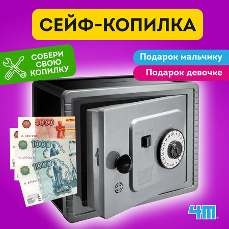 У каждого уважающего себя ребенка должен быть тайник. А лучше — сейф! С ключом, кодовым замком и охранной сигнализацией. Для надежной защиты карманных денег, дневника или секретных данных разведки. Вы можете собрать такой суперсейф самостоятельно! Просто следуйте инструкции, между делом изучая систему блокировки и подключения электрической цепи. Когда сейф будет готов, придумайте пин-код и заблокируйте систему. Предложите родителям или друзьям ее взломать. Но будьте спокойны, у них ничего не выйдет. Ведь ваш суперсейф оснащен тройной защитой. Чтобы его открыть шпиону придется заполучить не только ключ, но и секретный пароль. При неудавшейся попытке взлома раздастся сигнал тревоги. Враг будет пойман и обезврежен. Все по-взрослому, как в лучших детективных фильмах! Обратите внимание: сейф открывается только ключом. Кодовый замок предназначен для отключения сигнализации. В комплекте 6 панелей для сборки корпуса Передняя дверца с контактами и сигнализацией Задняя дверца с отсеком для батареек Циферблат Храповик и храповой рычаг Переключатель с корпусом Детали замка и ключ Винтики и другие крепления Подробная инструкция Для работы охранной системы требуется 1 пальчиковая батарейка АА, в комплект не входит. Размеры собранного сейфа 15×12.5×11 см. Работая и играя с оригинальным конструктором от 4М, ребенок развивает внимательность, креативность и любознательность. Постигает азы электроники и накапливает знания для дальнейшего обучения. Пусть его знакомство с наукой будет увлекательным и полезным! Как это работает? Батарея питания подключена к двум контактам: один расположен под замком, другой — на тумблере включения сигнализации. Эти контакты создают последовательную электрическую цепь. Тумблер также связан с кодовым замком, который блокирует положение переключателя. Поэтому, чтобы разблокировать тумблер, понадобится пин-код. Только после этого можно открывать сейф ключом. Но если повернуть ключ при заблокированном тумблере, электрическая цепь замкнется, и незамедлительно раздастся вой сирены. Посмотреть инструкцию
