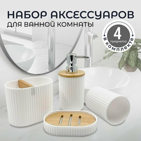 Набор аксессуаров для ванной комнаты: диспенсер для мыла, стакан для зубных щеток, стакан, мыльница; белый NQ STYLE