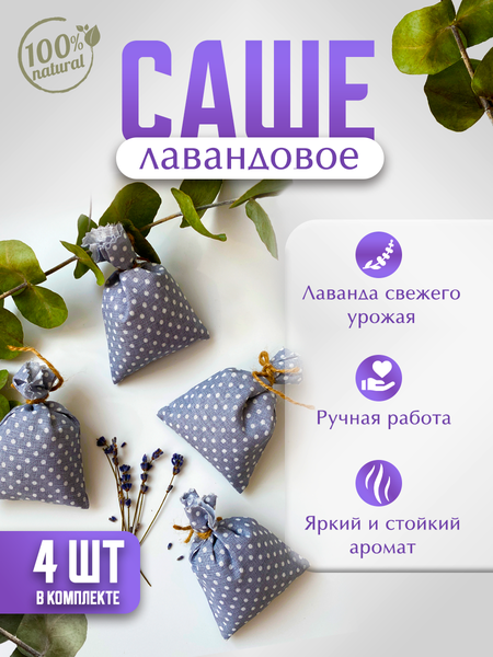 Набор из четырех лавандовых саше ручной работы (по 15 гр каждое) Яркие мешочки из 100% хлопка наполнены сушёными цветами и листьями крымской лаванды. Натуральный эко-наполнитель очищает воздух от неприятных запахов, оказывает обеззараживающий эффект. Способы применения: 1. Ароматные мешочки можно разместить в стопки с полотенцами и постельным бельем и потом наслаждаться лёгким ароматом и крепким сном, 2. разложить в меховые и шерстяные изделия для защиты от моли, 3. положить в машину в качестве натурального ароматизатора, к тому же лаванда в небольшом количестве повышает концентрацию внимания, 4. размять мешочек и вдыхать аромат лаванды для спасения от головной боли или бессонницы. Чтобы усилить аромат, немного разомните саше с лавандой. Набор с лавандовыми саше - это необычный и очень приятный подарок на Новый год, День влюбленных (14 февраля) и Женский день (8 марта) и другие праздники. Внимание! Дизайн мешочков может отличаться от представленного на фото.