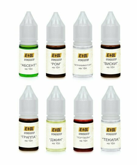 Набор ароматизаторов Etol (8 вкусов по 10 мл) "Все напитки мира" рассчитан на 10 л (каждого вкуса) или 80 л (общего) готового продукта и состоит из следующих вкусовых видов: 1. абсент на 10 л; 2. бонификатор на 10 л; 3. виски на 10 л; 4. граппа на 10 л; 5. джин на 10 л; 6. портвейн на 10 л; 7. ром на 10 л; 8. текила на 10 л. Приготовление: Ароматизатор Etol 10 мл добавьте в Ваш спиртовой раствор/дистиллят (из расчета 1 мл ароматизатора на 1 литр ) крепостью 40-45°. Тщательно перемешайте и дайте настояться полученному напитку 3-10 дней. Не добавляйте ароматизатор в спиртовой раствор крепостью более 60°.