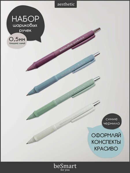 Набор из 4 штук шариковых автоматических ручек с синими чернилами beSmart - идеальное решение для всех, кто ценит качественную и красивую пишущую канцелярию. Этот набор ручек отлично подойдет для школы, института или офиса и станет незаменимым помощником в повседневных делах. Каждая ручка оснащена автоматическим механизмом, который предохраняет вещи от возможных "неприятностей" с чернилами и имеет удобный клип - зажим, который позволяет закрепить ручку на тетради или кармане. Автоматическая ручка - идеальный вариант для тех, кто постоянно теряет колпачки! Эргономичный корпус из качественного пластика с приятным на ощупь покрытием soft touch обеспечивает комфортное длительное использование. Удобная резиновая манжетка, расположенная на корпусе ручки, помогает снизить напряжение руки и предотвращает скольжение пальцев. Синие чернила обеспечивают легкое и мягкое письмо яркими насыщенными линиями толщиной 0,5 мм, быстро высыхают и не размазываются. В случае, если чернила закончатся, вы всегда можете заменить стержень и продолжить использование ручки. Этот комплект синих шариковых ручек - не только функциональные и надежные ручки для письма, но и милая канцелярия для девочек, мальчиков и взрослых, которая добавит ярких красок и комфорта в вашу повседневную жизнь.