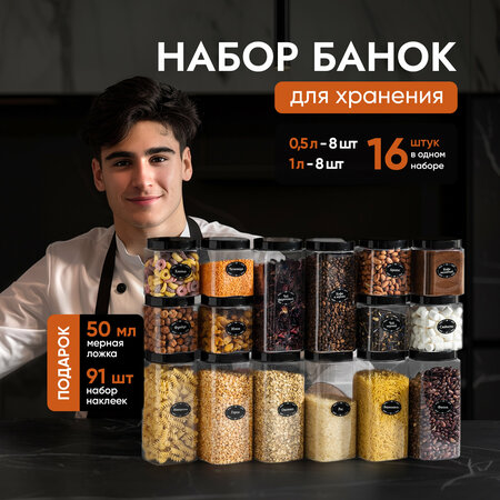 Наши банки для хранения - отличное решение для удобного и организованного хранения продуктов на Вашей кухне. В комплекте 16 штук. 1 л/8 шт и 500 мл/8 шт, Имеют прозрачный цвет и удобную винтовую крышку . Не откладывайте и сделайте вашу кухню более организованной с нашими удобными и эстетичными контейнерами для хранения! Что делает наши баночки для хранения такими привлекательными? Вот несколько причин, почему они должны быть в Вашей кухне: Материалы высокого качества: наши контейнеры выполнены из пищевого пластика, который абсолютно безопасен и не содержит вредных веществ. Вы можете быть уверены, что ваша еда будет храниться в безопасности. Удобный дизайн: легкий вес и компактные размеры наших банок делают их удобными в использовании , помогая максимально использовать пространство. Простота использования: каждая банка имеет наклейки с маркером, что поможет вам легко определить содержимое каждой емкости. Наклейки прочно фиксируются и не оторвутся даже при мойке контейнера. Всестороннее использование: наши контейнеры можно использовать не только на кухне для хранения пищевых продуктов (сыпучих), но и для хозяйственных нужд в ванной комнате, детской, гараже, ящиках и других помещениях. Они также отлично подходят для хранения стирального порошка, игрушек, корма для домашних животных и других мелочей. Емкости можно использовать и для выезда на пикник, для отдыха на природе, на даче. Герметичное хранение: крышки контейнеров плотно закрываются и обеспечивают герметичное сохранение продуктов. Вы можете быть уверены, что ваши продукты будут защищены от посторонних запахов, влаги и жуков-вредителей. Универсальный подарок: набор посуды будет идеальным подарком как для женщин, хозяек, так и для мужчин. Подарочный набор для дочери , мамы жены , подруги, любимой бабушки , дедушки, мужа, папы, сына. Не упусти шанс приобрести набор для сыпучих продуктов прямо сейчас! Важно: Контейнеры нельзя мыть в посудомоечной машине и использовать в микроволновой печи!