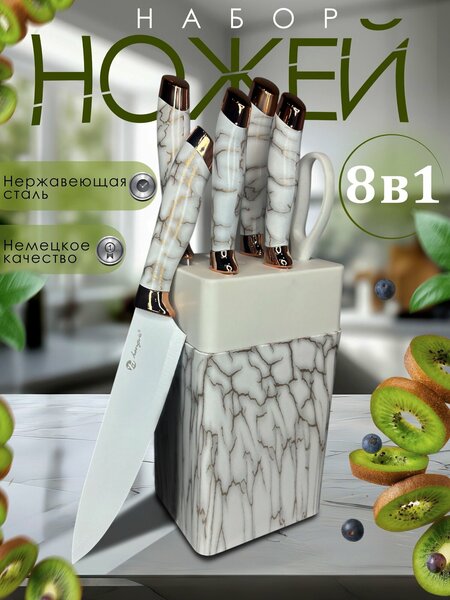 Набор ножей - это незаменимый инструмент на каждой кухне. Каждая хозяйка или хозяин оценит по достоинству прекрасный набор из нержавеющей стали В набор входят различные ножи и приспособления, которые необходимы для нарезки мяса, рыбы, овощей, хлеба и других продуктов. Ножи изготовлены из высококачественной стали, а также есть ножницы, что делает этот набор универсальным и подходящим для различных задач на кухне. Важная составляющая данного комплекта — универсальная точилка. Она обеспечит быструю заточку и поддержание изделий в отличном состоянии, без необходимости обращения к специалистам. Набор состоит из шести пяти проффесиональных ножей, ножниц и подставки в которой очень удобно хранить. Ножи в наборе качественные и острые, идеально подходят для различных видов резки, нарезки и разделки. Они могут быть использованы как в домашних условиях, так и в походах или на кемпинге. Все предметы выполнены из качественных материалов и продуманы до мелочей, чтобы обеспечить максимальное удобство и эстетику. ВАЖНО Каждый раз, когда ваш нож контактирует с водой и воздухом в течение длительного периода времени, он становится восприимчивым к ржавчине, так как происходит процесс окисления. Если вы столкнулись с такой проблемой, вы можете избавиться от уже появившейся ржавчины с помощью уксуса и лимонного сока. Так же можете воспользоваться специальными средствами для удаления ржавчины. В дальнейшем рекомендуем после использования протирать ножи. Нержавеющая сталь, так же как и обычная ржавеет, если за ней не ухаживать. По этой причине, мы рекомендуем после того как помыли ножи, протереть их.