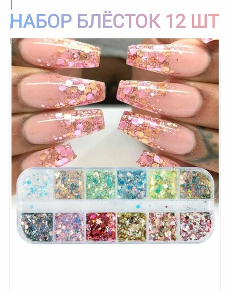 Блестки разных оттенков, расположенные в удобном боксе на 12 делений.
