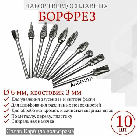 Набор Борфреза по Металлу Твердосплавная 10 предметов ф 6 мм Хвостовик 3 мм. Спиральная насечка