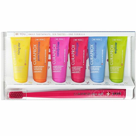 Набор BE YOU Mix Set из зубной щетки CURAPROX 5460 Ultra Soft и 6 паст разных вкусов: Rising Star (грейпфрут и бергамот) Explorer (яблоко и алоэ) Candy lover (арбуз и мята) Daydreamer (ежевика и лакрица) Challenger (джин-тоник и хурма) Pure Happiness (персик и абрикос)