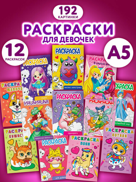Набор детских раскрасок Для девочек, А5, 140х200 мм, 12 штук, 16 страниц, ПП, 691077