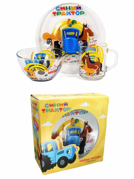 Гарантируем 100% одобрение всех заявок на возврат товара. Торговая марка посуды: Синий Трактор Коллекция стеклянной посуды "синий трактор" с изображением одноименного героя знаменитого мультфильма. Вся посуда коллекции создана по лицензии официального правообладателя. В состав набора входит кружка 250 мл, салатник 13 см 450 мл , тарелка 19 см. Яркий привлекательный дизайн. Подарочная упаковка. Экологически чистая посуда безопасна для здоровья, предназначена для детей старше 3-х лет. Продукцию можно использовать в СВЧ и в посудомоечной машине. Сделано в России. Ваш ребёнок капризничает за столом? Совсем не хочет слушаться и выступает против каждой новой ложки с настоящей акцией протеста? Превратите завтраки, обеды и ужины в занимательную игру! Набор детской посуды - верный помощник всех мам и пап. Красочные цвета и весёлый рисунок будут радовать чадо всякий раз, когда придёт время приёма пищи. Завтраки, обеды и ужины станут развлечением, а родители смогут, наконец, перестать беспокоиться: накормить ребёнка больше не будет проблемой! Красивая посуда для детей с героями представлена в подарочной упаковке - надежной красочной коробке. Из боковины подарочной коробки ребенок самостоятельно может вырезать закладку с любимым героем. Детская посуда для кормления - это готовый подарок на Новый год или День рождения. Набор посуды для ребенка в подарочной упаковке обязательно порадует подростка. Для сохранности рисунка не рекомендуется применять жёсткие моющие средства и подвергать посуду длительному воздействию солнечных лучей. Столовый сервиз для детей – это не только красивая посуда для кухни, но и праздничная посуда для сервировки детского стола.