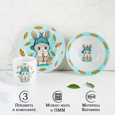 Детская посуда, набор из керамики Доляна «Милый зайка», 3 предмета, цвет белый