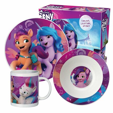 Набор посуды «My Little Pony» ? волшебный подарок для вашей дочки! Фарфоровая посуда создаст для ребенка атмосферу сказки, волшебства и увлекательных приключений! Детская кружка, тарелочка и салатник будут поднимать настроение, радовать глаз, и сделают любимые блюда еще вкуснее. Посуду из фарфора можно использовать для горячих и холодных блюд, мыть в посудомоечной машине и нагревать в СВЧ-печи. Не рекомендуем мыть посуду абразивными моющими средствами и хранить под прямыми солнечными лучами, чтобы рисунок дольше оставался ярким. Подарочная коробка подчеркнет уникальность набора и выделит его среди других наборов в магазине. Количество предметов: 3;