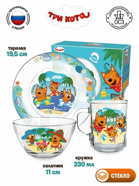 Подарите радость и превратите каждый прием пищи в веселое приключение с уникальным набором посуды для детей с изображением любимых котов из популярного мультсериала "Три кота"! Этот очаровательный набор посуды детский с Коржиком, Карамелькой и Компотом поднимет настроение и подарит улыбку вашему малышу за столом. Представляем полноценный набор посуды детский стеклянный, который включает 3 незаменимых предмета: удобную плоскую тарелку (диаметр 19,5 см), вместительный салатник (объем 295 мл) и комфортную кружку (230 мл). Вся посуда для детей изготовлена из высококачественного прозрачного стекла, что делает ее не только безопасной и гигиеничной, но и позволяет ребенку видеть содержимое, пробуждая аппетит. Этот набор посуды стекло выполнен по официальной лицензии, что гарантирует подлинность и яркость изображений Коржика, Карамельки, Компота и их родителей, а также стильный декор в ярких тонах. Это не просто посуда для детей для еды, это целый мир любимых героев на вашем столе! Красивая посуда в подарок поставляется в надежной и красочной подарочной упаковке. Из боковины коробки ребенок сможет самостоятельно вырезать забавную закладку с любимыми персонажами. Ищете идеальный подарок? Наша детская посуда для кормления – это готовое решение, которое станет прекрасным презентом на Новый год или День рождения. Эта посуда для кормления малыша набор отлично подойдет как детская посуда для кормления для малышей, так и для детей постарше. Посуда для кормления для мальчика будет кстати на 23 февраля, а посуда для девочки в подарочной упаковке обязательно порадует малышку к 8 марта. Важно: данная стеклянная посуда с рисунком не предназначена для использования в посудомоечной машине и СВЧ-печи. Для сохранения яркости и долговечности рисунка не рекомендуется применять жесткие моющие средства и подвергать посуду длительному воздействию солнечных лучей.
