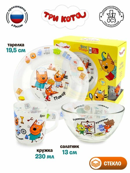Подарочный набор детской посуды с изображением героев мультсериала Три Кота поднимет настроение и подарит улыбку за приемом пищи. В столовый детский сервиз входит 3 предмета: плоская тарелка (диаметр 19,5 см), салатник (объём 295 мл) и кружка (230 мл). Детская посуда изготовлена из прозрачного стекла. Тарелка, миска и чашка набора посуды для детей украшены изображением героев мультфильма Три Кота - Коржика, Карамельки и Компота. Красивая посуда для детей с героями представлена в подарочной упаковке - надежной красочной коробке. А отсканировав QR-код на упаковке, малыш может повзаимодействовать с Коржиком, Карамелькой и Компотом в виртуальной реальности! Для этого не нужно устанавливать приложение, достаточно навести камеру и вот уже любимые персонажи оказываются так близко! Детская посуда для кормления - это готовый подарок на Новый год или День рождения. Набор посуды для мальчика будет кстати на 23 февраля, а посуда для девочки в подарочной упаковке порадует малышку на 8 марта. Стеклянная посуда для детей с рисунком непригодна для использования в посудомоечной машине и СВЧ-печи. Для сохранности рисунка не рекомендуется применять жёсткие моющие средства и подвергать посуду длительному воздействию солнечных лучей. Столовый сервиз для детей – это не только красивая посуда для кухни, но и праздничная посуда для сервировки детского стола.