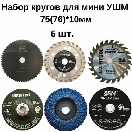 Набор кругов LIXINTOOL из 6шт для мини УШМ 75/76 х 10мм, для разных материалов - камень, дерево, пластик, металл и т. д. Виды работ - зачистка, шлифовка, резка, распил и т. д. В наборе идут круги: