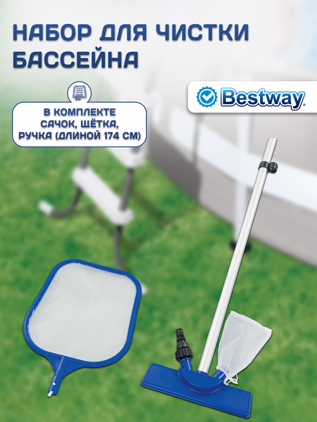 Набор для очистки бассейнов — это необходимый инвентарь, который должен быть у каждого обладателя каркасного или надувного бассейна. С ним вы затратите меньше сил и времени на очистку, а сам процесс пройдёт легко и приятно. Набор состоит из алюминиевой телескопической трубки, с помощью которой вы сможете достать даже до самого дальнего угла бассейна, вакуумной щётки с прозрачным сетчатым мешочком для сбора мусора под водой, а также сачка для улавливания крупного плавающего мусора, например листьев, травы и прочего. С таким набором Вы быстро и легко очистите свой бассейн!