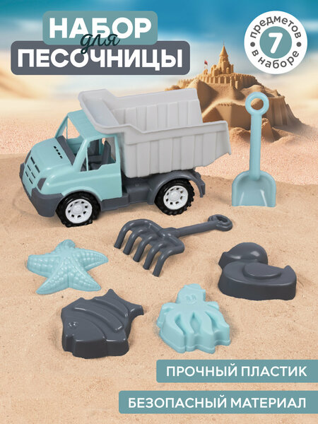 Набор для песочницы с грузовиком станет отличным подарком для мальчиков и девочек. В песочный набор входит всё самое необходимое для весёлой игры: машинка-грузовик, формочки для песка, лопатка, грабли. Реалистичный дизайн и привлекательная расцветка грузовика не оставят равнодушным никого вокруг. В кабину можно посадить игрушечного водителя, придумывая новые игровые сюжеты. Грузовик машинка имеет крепкий корпус и подвижные элементы, кузов поднимается и опускается, в нём можно перевозить песок или мелкие предметы. Большие устойчивые пластиковые колеса надежно закреплены и позволяют катать самосвал практически по любой поверхности. Игрушки для песочницы имеют удобные размеры, ими комфортно играть даже самым маленьким. Элементы набора не имеют острых краёв и мелких деталей, изготовлены из качественной пластмассы, не содержащей вредных веществ. Они полностью безопасны для детей, имеют необходимый сертификат и соответствуют установленным требованиям. Игрушки для песка легко чистятся и быстро сохнут после мытья. На них не скапливаются бактерии, что делает процесс использования более гигиеничным. Набор игрушек для песочницы подойдет для игры с песком, с водой, а также с кинетическим песком. Зимой набор подойдет для игры со снегом. Благодаря компактным размерам, комплект легко хранить и брать с собой на пляж, на дачу или в детский сад. Игра с песком развивает воображение, мелкую моторику, творческие способности, благотворно влияет на общее развитие. Комплектация: машинка-грузовик 23 см, 4 формочки 9 см, лопатка 15 см, грабли 15 см Упаковка: сетка Материал: пластик