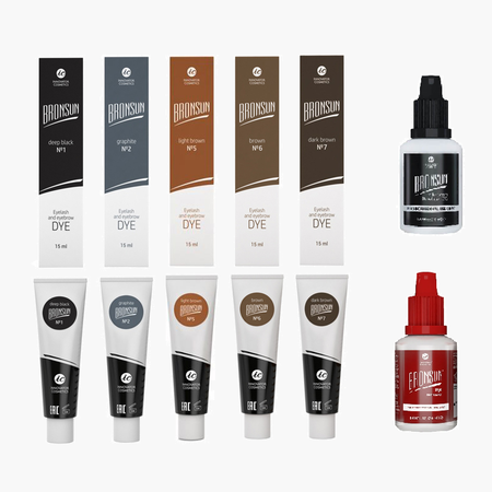 Набор для окрашивания бровей и ресниц: Краска Bronsun 5 штук х 15 мл : №1 черный , №2 графит, №5 светло-коричневый, №6 коричневый, №7 темно-коричневый + Оксидант 3%, 20 мл. + Ремувер для удаления краски с кожи Bronsun Dye remover, 20мл