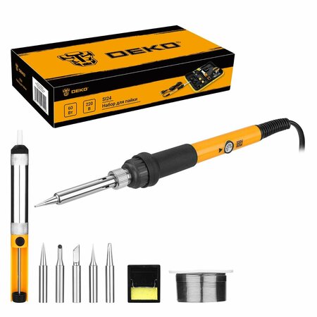 паяльник 60 Вт, 220 В (1 шт.), комплект из 5 типов наконечников (конус, игла, клин, скос и ножевидное), держатель для паяльника (1 шт.), губка для очистки паяльного жала (1 шт.), припой на катушке (1 шт.), оловоотсос для припоя (1 шт.), пенал на молнии (1 шт.).