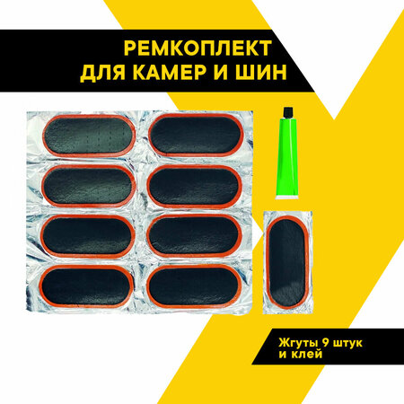 Универсальный ремкомплект для самостоятельного ремонта резиновых камер и шин автомобилей, мотоциклов, велосипедов и т. д. Глубокий прокол, коварный боковой порез – не проблема, если в бардачке или рюкзаке есть набор для ремонта шин «Топ Авто»! В состав ремкомплекта входят резиновые жгуты (латки, заплатки) в количестве 9 штук, а также компактный тюбик клея для ремонта шин.
