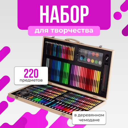 Набор для рисования и творчества 220 предметов в деревянном кейсе