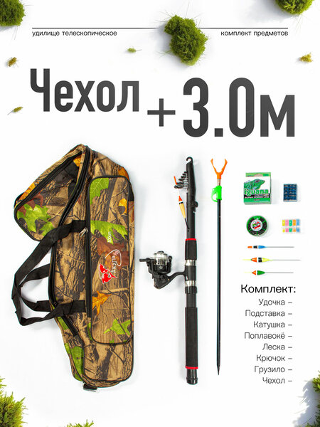 Набор для рыбалки - входит все необходимое: удилище с катушкой - 1 шт., поплавок - 3 шт., чехол для удочки и снастей - 1 шт., подставка для удочки - 1 шт., леска 100 метров (0,18 мм) - 1 шт., набор грузил, набор крючков, набор кембриков