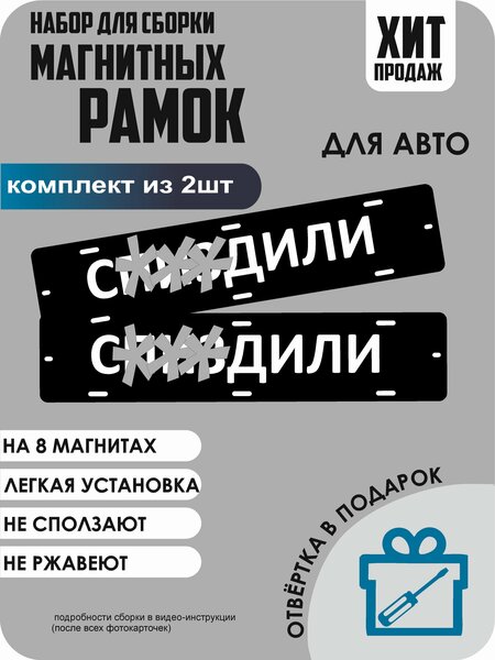 С помощью этого набора Вы сможете сделать из своей обычной рамки магнитную! Все подробности сборки в видео-инструкции. цвет указан для объединения, товар точно такой ЖЕ КАК на фотографиях комплектация 1. Набор винтов, гаек и шайб - 1комплект. 2. Магниты - 16шт. 3. Пластины - 2шт. 4. Набор противоскольжения - 2 комплекта. 5. Отвёртка "+" - 1шт Магнитная рамка - идеальный автоаксессуар для каждого автомобилиста. Этот набор рамок номерных знаков принесет стиль и оригинальность в ваш автомобиль. Сделанные из высококачественного ABS пластика, эти рамки прочные, долговечные и приятные на ощупь. Магнитная рамка подходит для вех типов автомобилей - от маленьких легковых до грузовых. Она легко крепится на государственные номера, обеспечивая надёжную фиксацию благодаря магнитному креплению. Никаких дополнительных инструментов или навыков не требуется - просто прикрепите рамки к номеру и наслаждайтесь ее преимуществами. Неодимовые магниты, используемые в этом рамке, обеспечивают мощное притяжение и гарантируют, что рамка останется на месте даже при высоких скоростях или при движении по неровной дороге. Вы можете быть уверены, что ваш номерной знак останется на месте и не потеряется. Магнитная рамка - это не только практичный автоаксессуар, но и стильный элемент дизайна вашего автомобиля. Черный цвет рамки придаст вашему авто глубокий и элегантный вид. Она прекрасно сочетается с любым цветом кузова и добавляет нотку изысканности. Этот набор рамок номерных знаков также является отличным подарком для дня рождения, нового года или любого другого праздника. Он подходит как для мужчин, так и для женщин, идеально подойдет для вашего мужа, жены, отца, матери, брата, сестры, сына, дочери, зятя, тещи, тети, свекрови, друга, коллеги и даже любовника или любовницы. Магнитная рамка - это надежный автоакеессуар, который привлечет внимание окружающих и подчеркнет вашу индивидуальность. Не упустите возможность приобрести этот уникальный товар и добавить немного стиля в ваш автомобили. Закажите его прямо сейчас и наслаждайтесь преимуществами магнитной рамки.