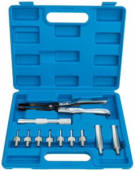 Щипцы для снятия сальников клапанов - 1 шт. Рукоятка для установки направляющих 150 мм. - 1 шт. Удлинитель с внешним диаметром 12.8-14.8 мм. - 2 шт. Адаптеры для сальников 5, 5.5, 6.5, 6, 7, 8 и 3/8" - 7 шт.
