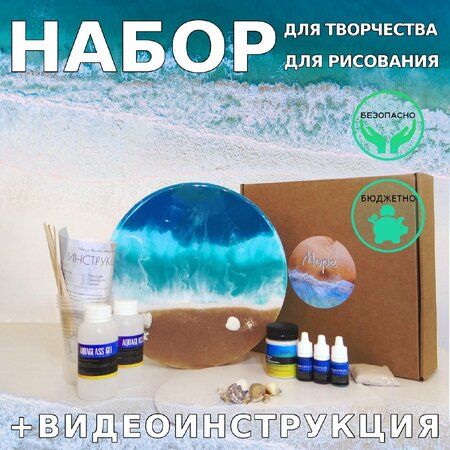 Эпоксидная смола для творчества набор Морской для рисования в технике resinart. В набор входят эпоксидная смола, круглый артборд холст, краски-красители для смолы, морской декор (песок и ракушки), стаканчики, размешиватели, перчатки, фартук, очень подробная инструкция. Набор подойдет детям и новичкам, тем, кто ни разу не работал со смолой. Эпоксидная смола, которая входит в набор, безопасна и имеет доступ к контакту с пищевой продукцией. Идеальный подарок для вас и ваших близких! И вот почему:- безопасность: наша смола, входящая в набор, соответствует всем санитарно-гигиеническим нормам РФ. Вы можете не волноваться о здоровье вашей семьи;- универсальность: рисовать смолой интересно как женщинам, так и мужчинам любого возраста (а дети остаются в диком восторге от данного вида творчества);- экономите время: не нужно часами искать подарок и упаковку к нему (набор уже сложен в презентабельную крафтовую коробку, которую можно и нужно сразу вручить);- бережете нервы: выбрали - получили - подарили. Рисование смолой, разливание её по стаканчикам и артборду, укладывание камней и ракушек - увлекательный и в то же время успокаивающий процесс. А результат - картина, которой можно украсить дом. Таким образом, вы дарите не просто подарок. Вы дарите эмоции, спокойствие, будущее украшение для дома и гордость за свои старания. А, возможно, и новое хобби! В набор входит очень подробная пошаговая инструкция. А если у вас возникнут вопросы, вы всегда сможете проконсультироваться у нашего мастера. Комплектация: 1. Эпоксидная смола AquaGlass 2. Артборд Круг 25 см 3. Красители, 3 шт. 4. Порошок для создания волн 5. Песок кварцевый 6. Ракушки и морская звезда 7. Мох 8. Галька 9. Стаканчики 10. Размешиватели 11. Фартук 12. Перчатки 13. Подробная инструкция