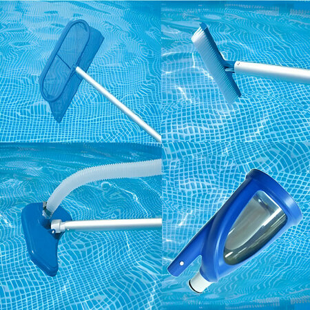 С набором для чистки — вы избежите таких проблем, как размножение бактерий и заплесневение. Благодаря прочной телескопической ручке длиной до 279 см вы сможете очистить каркасные и надувные бассейны размером от 549 см в диаметре. Справиться с загрязнениями теперь легко и просто. В комплект входят: телескопическая алюминиевая ручка длиной 279 см; сачок;2 насадки; щётка; колба-фильтр; гофрированный шланг длиной 750 см. Способ применения. Для сбора осадка и мусора со дна бассейна нужно подключить набор по следующей схеме: присоедините гофрированный шланг одним концом к отверстию в стенке бассейна, через которое поступает вода в фильтрующий насос; прикрепите к другому концу одну из насадок для очистки дна бассейна; при включении насоса медленно передвигайте щётку по дну; вода с мусором проходит через колбу-фильтр (частично крупный мусор останется в ней) и поступает в насос, а чистая возвращается в бассейн. Характеристики: телескопическая алюминиевая ручка выдвигается на 279 см; сачок для сбора мусора с поверхности; для нормальной работы пылесоса требуется насос-фильтр с минимальной мощностью 3028 л/час; для чистки стенок и дна предназначена подводная насадка-пылесос с колбой-фильтром для сбора мусора; материал: пластик.