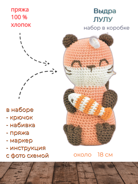 Выдра Лулу Пряжа в наборе из 100% переработанного турецкого хлопка. Уникальные и неповторимые, амигуруми – это волшебные игрушки, созданные с любовью. Набор для вязания амигуруми – это ваше волшебное оружие для воплощения самых прекрасных идей. Невероятно мягкая и приятная на ощупь пряжа позволит вам воплотить задумку. Пряжа в наборе из 100% переработанного хлопка, что позволяет создавать плотный ряд и формировать фигурки амигуруми. Вам не потребуется бесконечных поисков подходящих глаз и деталей для вашей игрушки. В комплекте с набором вы найдете все необходимое: глазки и прочую фурнитуру для создания неповторимого образа вашей амигуруми. Вы можете воплотить в жизнь любую идею и создать игрушку, которая не оставит равнодушных. Набор для вязания амигуруми – это не только развитие своих творческих навыков и возможность познакомиться с увлекательным миром вязания. Это также отличное решение для тех, кто ищет необычный, оригинальный и запоминающийся подарок. Амигуруми – это возможность создавать свои уникальные игрушки. Желаете порадовать себя или близкого человека? Набор для вязания амигуруми – это то, что вам нужно! Подарите вдохновение и способ воплотить в жизнь свои идеи. После первого столбика вы не сможете остановиться. Покупайте набор для вязания амигуруми и станьте причастным увлекательному миру вязания игрушек амигуруми. материалы: Крючок, Пряжа, Иголка, Маркер ряда, набивка Законченный Размер Около 18 см в высоту