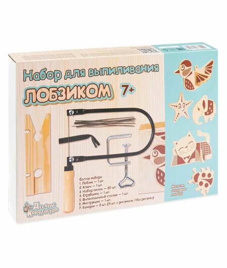 Набор для выпиливания лобзиком – это, в первую очередь, заготовки для изготовления поделок для дома или сада. Сделать без лобзика их нельзя, поэтому он и входит в состав набора. Сам по себе лобзик, по большому счету, бесполезен без ключа, выпиловочного столика, струбцины и запасных полотен. Вот почему их вы тоже найдете внутри упаковки. Пользуясь случаем, еще раз напоминаем, что в набор для выпиливания лобзиком входит настоящий, а не игрушечный инструмент, способный нанести травму при неправильной эксплуатации. Не давайте набор детям младше рекомендованного производителем возраста (7+)! Имейте ввиду, что контроль со стороны взрослого обязателен даже если ребенок старше семи лет. В наборе нет ничего из Китая, все сделано в России. Полотен 20 штук, на первое время должно хватить. Весь состав набора виден на упаковке, чтобы не покупать кота в мешке. Инструкция сделана максимально подробной. Это важно для тех родителей, кто уже позабыл, как работать лобзиком или для кого выпиливание лобзиком в свое время прошло мимо. Материал: Дерево, металл;