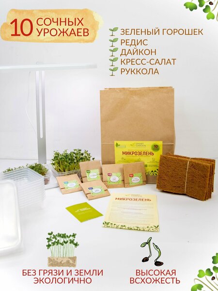 Наслаждайтесь пользой молодых ростков микрозелени, выращивая сочный и полезный урожай у себя дома. Микрозелень набор для выращивания был разработан нами совместно с опытным садоводом! В комплекте есть всё необходимое для свежего урожая: - 5 видов семян микрозелени для проращивания, - 10 экологически чистых кокосовых коврика, без грязи и земли; - 5 многоразовых двухуровневых лотков с крышкой - подробная памятка для выращивания вкусной, не горькой микрозелени. Если следовать указаниям, то микрозелень уже через пару дней появится на вашем столе. Идеальный вариант, если вы выбрали правильное питание в любое время года, без грязи и земли! В каждый набор 5 видов семян микрозелени, среди которых рандомно: микрозелень гороха, редис, дайкон, кресс-салат, руккола микрозелень и горчица белая, чиа, кейл, кинза и свекла красная. Семена микрозелени великолепно дополнят салат, зелёные смузи, украсит супы, станет полезным гарниром к мясу, если вы желаете разнообразить трапезу чем-то легким и ароматным. Микрозелень для проращивания не прихотлива в уходе, поэтому для здорового роста будет достаточно комнатных условий с комфортной температурой и умеренным уровнем влажности (при переизбытке влаги микрозелень может начать горчить!). А если вы хотите ускорить процесс в холодное время года, то обратите внимание на ультрафиолетовую лампу Light - найти ее можно в каталоге - просто нажмите на название бренда в карточке товара! С выращиванием справятся даже маленькие садоводы! Такой досуг понравится каждому ребёнку и взрослому, поэтому наш набор микрозелени можно преподнести как подарок дочке, сыну, маме, бабушке, сестре, как презент на новоселье или просто так!