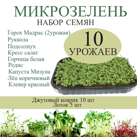 Набор для выращивания микрозелени 10 урожаев: горчича жёлтая 6гр, горчица белая 6гр, капуста японская Мизуна красная 6гр, кресс салат Весенний 5гр, Редис Аквамарин 7гр, руккола 5гр, Горох Мадрас 30гр, (2Комплекта), Подсолнух 25гр, Лен коричневый 6гр, клевер красный 6гр, 5 лотка с дренажными отверстиями, 10 джутовых коврика, 5 лотков с дренажными отверстиями, 10 джутовых коврика. Всхожесть семян до 95%, урожай через 7-8 дней. Семена подходят для выращивать в открытом грунте. Проращивание общая информацияэлектронная; бумажная в набор); Можно выращивать без дополнительного оборудования. Балкон, тераcса, комната. Семена подходят для выращивания в земле на грядке. Замочить коврик в теплой воде Равномерно распределить на коврике Опрыскать семена из распылителя для растений Поставить лотки в затемненное место на 2-3 дня Опрыскивать 1 раз в день. ! Семена и коврики должны быть влажными! Посте появления первых всходов лоток нужно выставить на солнечную сторону или под лампу. Проростки готовы для употребления через 5-7дней Микрозелень — это молодые побеги овощных или корнеплодных культур, реже злаковых, в стадии, когда появляются первые листья. Полезные свойства микрозелени: Все виды микрозелени обогащены рекордным количеством витамина С. Также в ней содержатся витамины группы В, Е, РР, фолиевая кислота, железо, фосфор и магний. Входящие в состав эфирные масла обладают антиоксидантными свойствами. Микрозелень благотворно влияет на иммунную и пищеварительную систему, имеет низкую калорийность, не является тяжёлой для переваривания пищей и снижает уровень холестерина. Регулярное употребление микрозелени избавляет организм от токсинов и способствует более активной регенерации клеток. Важно учитывать, что даже на микрозелень может быть аллергия или непереносимость. Всемирная организация здравоохранения рекомендует употреблять в день около 30–50 граммов зелени для хорошего самочувствия. Микрозелень можно добавлять в салаты, закуски, супы, смузи, использовать как самостоятельный гарнир к рыбе или мясу. Теги: подарочный набор, день матери, набор подарочный, микрозелень семена, для выращивания микрозелени, выращивание растения, выращивание микрозелени, набор для выращивания растений для детей, выращивать растения, набор микрозелень, микрозелень.