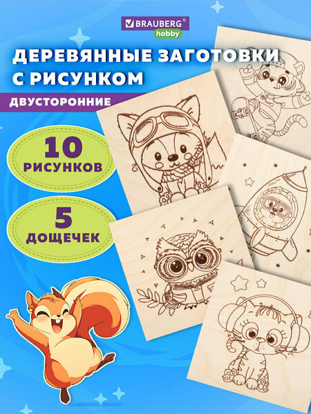 Набор для выжигания по дереву, деревянные заготовки для творчества Зверушки, 5 штук 10 рисунков, 15x15 см, Brauberg Hobby, 665304