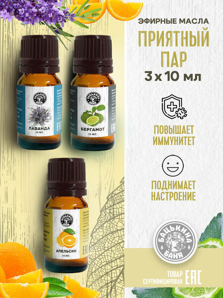 Набор эфирных масел для бани и сауны содержит в себе органические натуральные эфирные масла апельсин, лаванда, бергамот. Ароматическое масло применяется, как косметика, для массажа, защита при солнечных ожогах, как уход за кожей лица и тела, изготовления смеси от целлюлита, от прыщей и для ароматизации дома, ванны, обогащения кремов и шампуней, аромамедальонов. Аромомасло подходит для нанесения на волосы, как косметическое масло для лица. Масла применяются в мыловарении, изготовлении свечей. Эфирное масло предназначено для использования в паровой бане и сауне. Косметический эффект масел сохраняет красоту кожи лица и тела, здоровье волос. Аромо масло избавляет от целлюлита. Уход за телом и лицом. Аромамасла подходят для аромалампы, саше, аромадиффузор. Используется, как жидкий ароматизатор для дома, для медитации и йоги, для расслабления или для поднятия настроения. Проверяйте непереносимость для эфирных масел. Натуральная органическая косметика Бацькина баня делает Ваш день лучше.