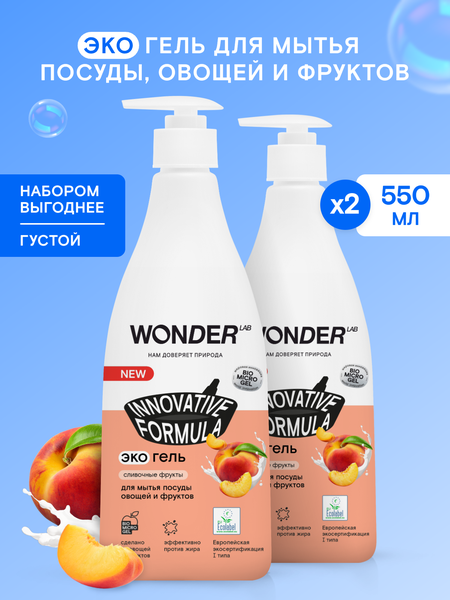Средство для мытья посуды WONDER LAB - это экологичный гель с нежным ароматом сливочных фруктов. Он эффективно удаляет жир, остатки пищи и неприятные запахи с посуды, при этом не оставляя разводов и придавая ей блеск. Гель подходит для мытья овощей, фруктов, ягод и орехов, смывая с них поверхностные консерванты, пыль и загрязнения. Он полностью смывается в считанные секунды, что позволяет экономить воду и исключает попадание остатков в организм. Средство не сушит и не раздражает даже самую чувствительную кожу, а также является PH нейтральным. Гипоаллергенность подтверждена по результатам клинических исследований. Гель для посуды подходит для септиков и не вредит окружающей среде. Аромат сливочных фруктов делает процесс мытья посуды еще приятнее. Гель для мытья посуды WONDER LAB - это выбор в пользу экологичности, безопасности и эффективности. При заказе вам доставят упакованный набор из двух штук и по более низкой цене, если покупать средство по отдельности. Это делает покупку выгоднее. WONDER LAB - это российский ЭКО бренд, который заботится об окружающей среде и здоровье людей. Все средства бренда не содержат токсичных компонентов и опасных для природы или человека веществ. Высокая эффективность эко средств WONDER LAB основана на инновационной технологии BIOMICROGEL®, разработанной на основе растительных компонентов: крахмала, пектина и целлюлозы, которые получают из натуральных фруктов и овощей. BIOMICROGEL® разлагается в окружающей среде на 98 % за 24 часа, поэтому безопасен для всех членов семьи и природы. WONDER LAB предлагает широкий выбор товаров для стирки и уборки, ухода за телом и волосами, а также средств для мам и малышей. Вы можете ознакомиться с каталогом бытовой химии и товаров для дома Wonder lab - нажав на название бренда справа.